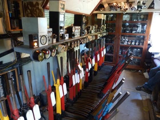 I wondered were they would be—no railway line there would still use old signal boxes. Then I found out: Two thirds of Richard's garden are sort of a signalling company's storage, with three fully working complex signal boxes, all connected to a relay simulator built from an old telephone exchange!